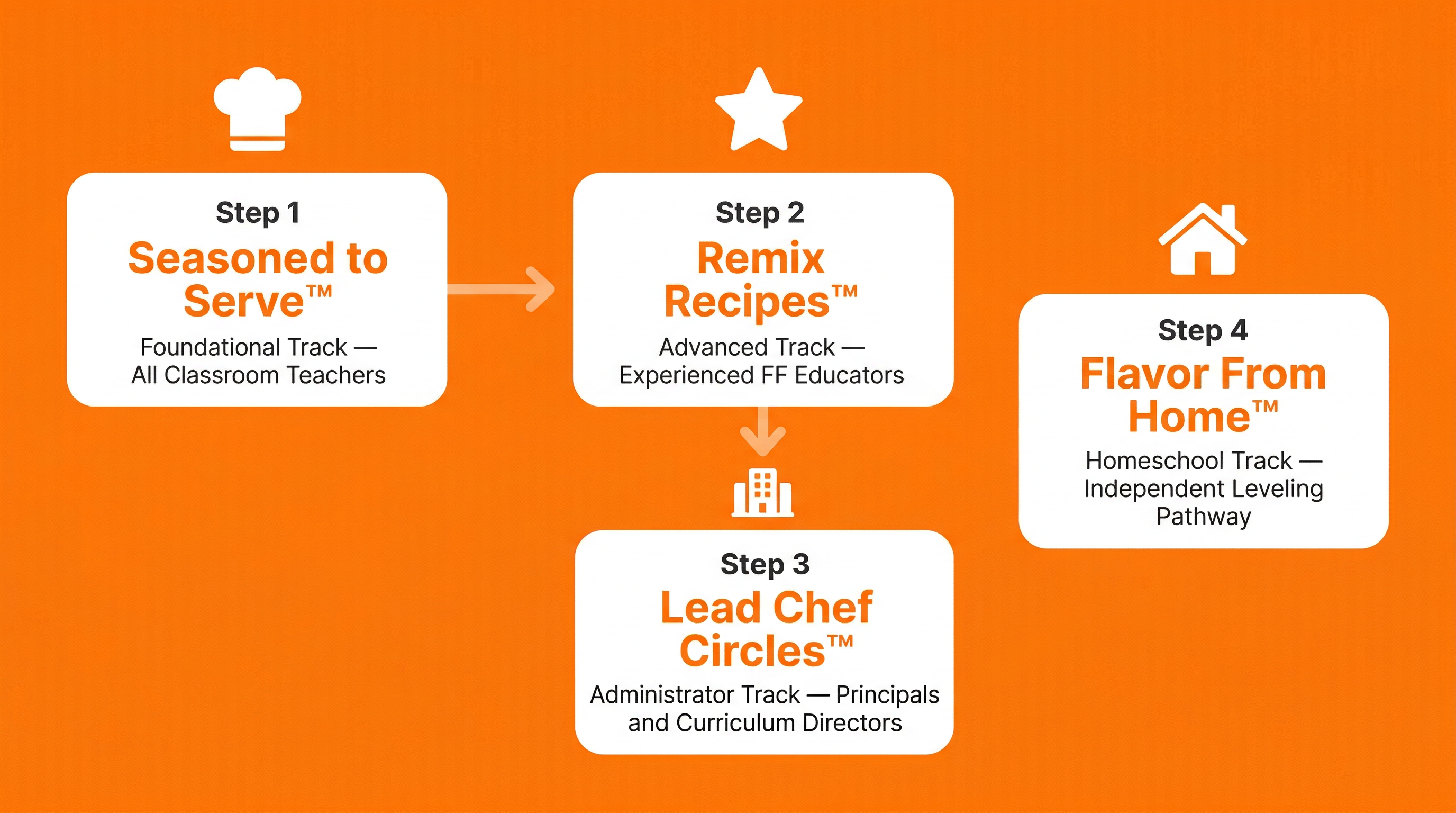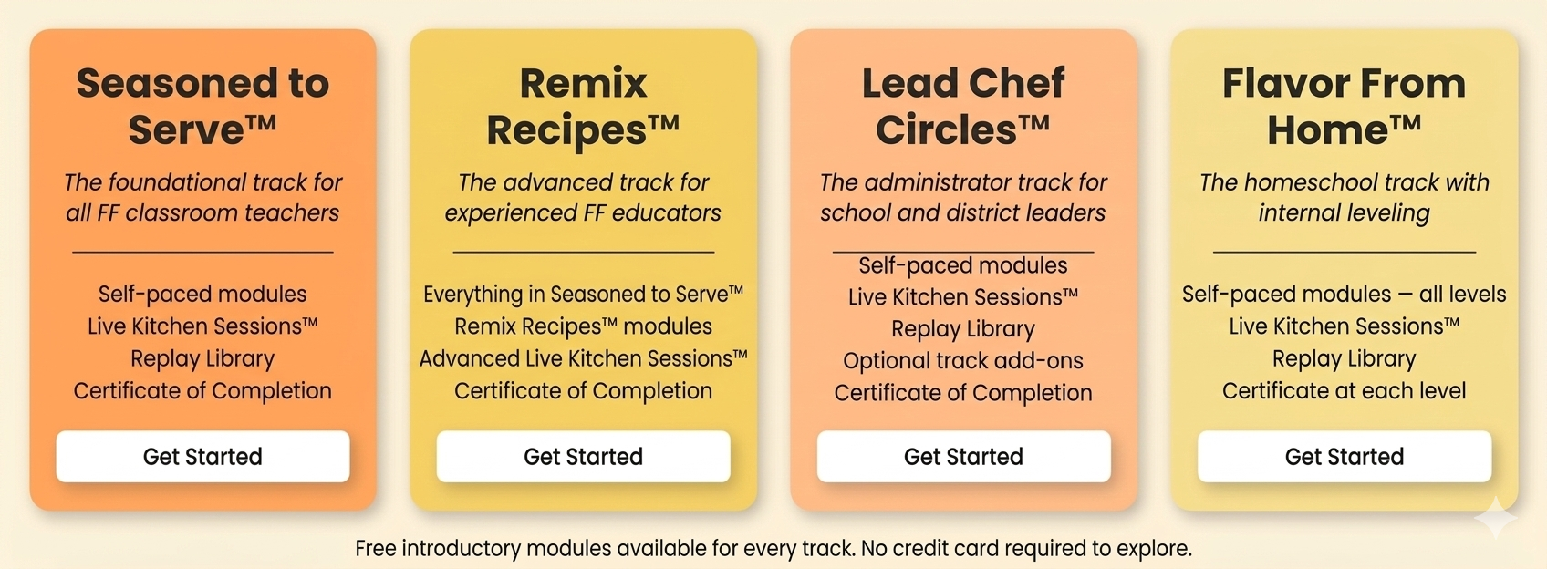 Every FF classroom teacher starts here. Seasoned to Serve™ builds deep understanding of the Flavorful Foundations™ philosophy, frameworks, and instructional practices, giving teachers everything they need to deliver FF with confidence from day one. This is the prerequisite track before advancing to Remix Recipes™.
