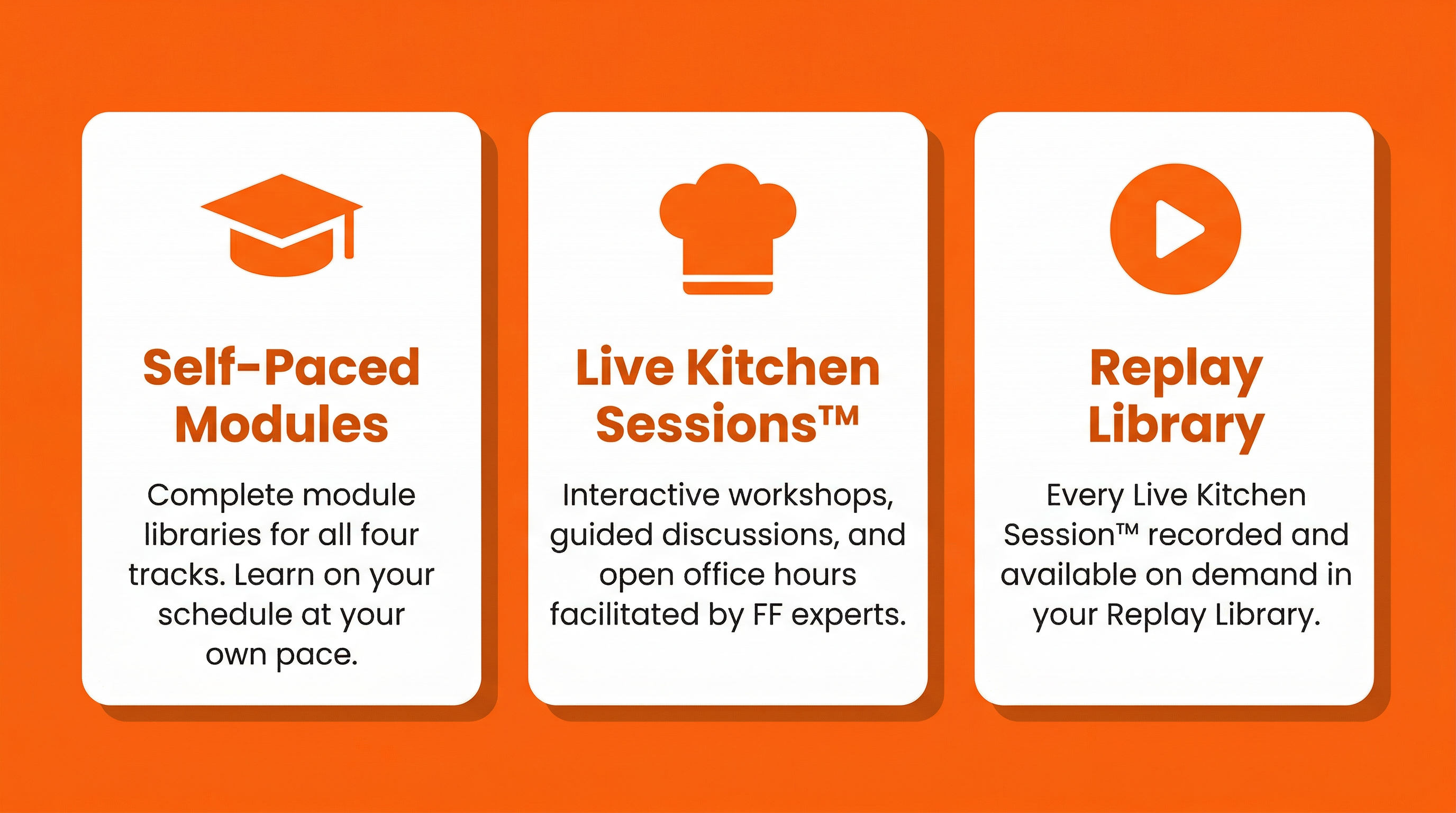 Every track is a paid subscription that includes self-paced modules, Live Kitchen Sessions™, and Replay Library access.